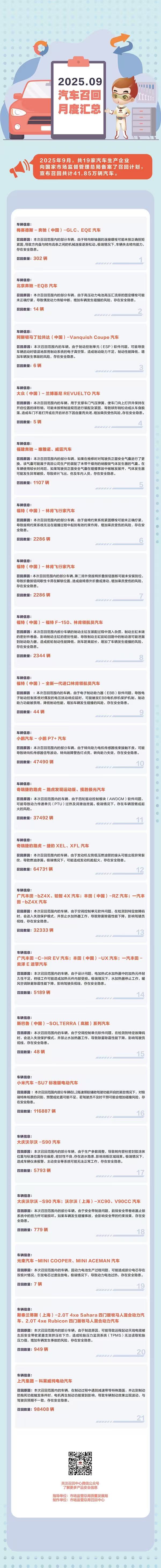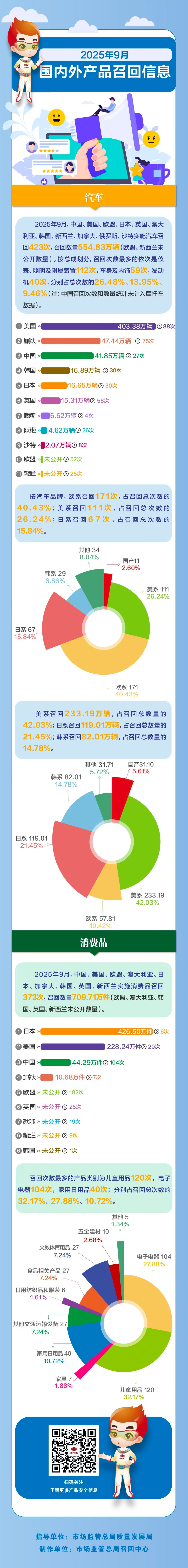 同日,国家市场监管总局还披露《2025年9月国内外产品召回信息》,其中汽车部分显示,2025年9月,中国、美国、欧盟、日本、英国、澳大利亚、韩国、新西兰、加拿大、俄罗斯、沙特实施汽车召回423次,召回数量554.83万辆(欧盟、新西兰未公开数量)。按总成划分,召回次数最多的依次是仪表、照明及附属装置112次,车身及内饰59次,发动机40次,分别占总次数的26.48%、13.95%、9.46%(中国召回次数和数量统计未计入摩托车数据)。
